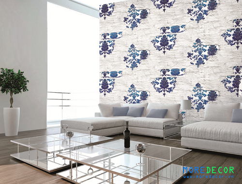 Một không gian thật sang trọng và hiện đại đang hiện ra trước mắt chúng ta. Mẫu giấy dán tường hàn quốc với thiết kế độc đáo và màu sắc hài hòa. Hình ảnh họa tiết hoa văn được cách điệu màu tím quyến rũ và màu xanh ngọc lạ mắt trên màu nền sang pha vân gỗ. Tất cả điều đó đã tạo nên một bức tranh đậm chất nghệ thuật. Cùng với bộ sofa màu trắng tinh khôi quen thuộc và những chiếc gối màu xanh ngọc càng làm cho căn phòng trở nên đầy ấn tượng và cuốn hút chúng ta. Thiết kế này vừa đậm chất hiện đại vừa mang âm hưởng cổ điển. Đây là mẫu thiết kế rất sáng tạo và phù hợp với nhiều không gian.