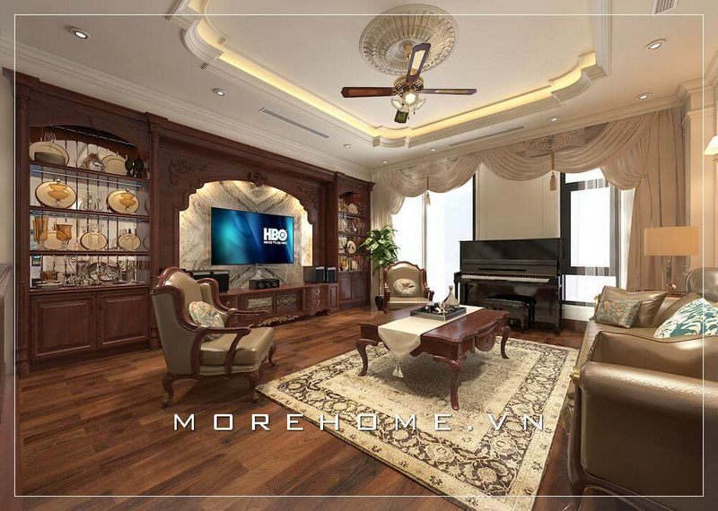 Ý tưởng trang trí phòng khách phong cách tân cổ điển sang trọng với nội thất gỗ tự nhiên cao cấp mang đến không gian tiếp khách đẳng cấp cho ngôi nhà