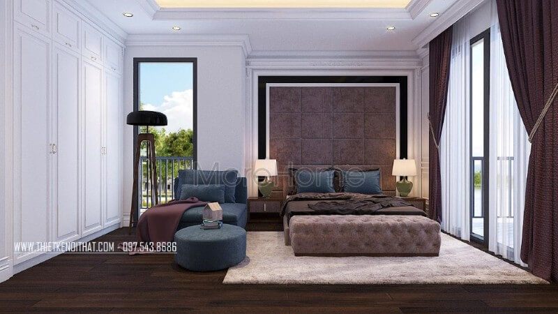 Nội thất phòng ngủ biệt thự hiện đại được KTS bố trí một cách khéo léo, hợp lý vừa mang lại tính sang trọng, vừa tạo cảm giác cơi nới cho không gian phòng ngủ thêm rộng thoáng hơn
