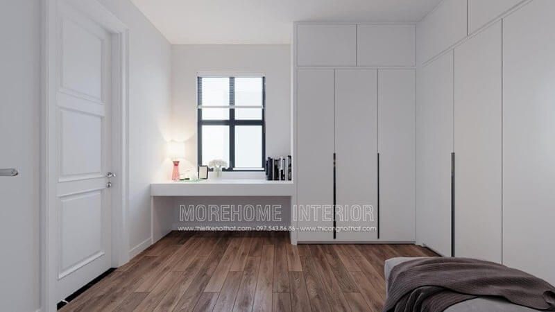 Tủ quần áo hiện đại màu trắng với kích thước lớn có thể được sử dụng để tiết kiệm diện tích không gian căn phòng ngủ bởi những ốp dọc mảng tường.