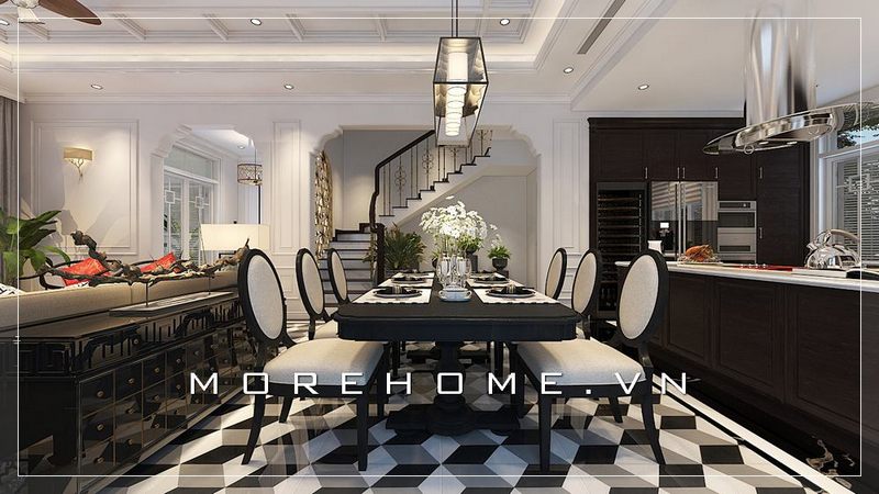Mẫu thiết kế nội thất cho phòng ăn có phong cách tân cổ điển sang trọng và đẳng cấp để tạo nên một biệt thự đẹp.